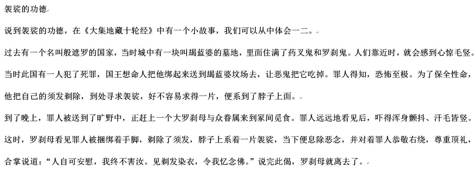 最近就看到有个佛学网站上发了一个佛教故事:说在《大集地藏十轮经》中记载过去有叫般遮罗的国家,国王想命一个犯了法的罪人绑起来送到朅蓝婆坟场去,让恶鬼把他吃掉。罪人得知,恐怖至极。为了保全性命,他想方设法把自己的须发剃除,托亲寻求袈裟,好不容易求得一片,便系到了脖子上面。到了晚上,罪人被送到了旷野,正赶上一个大罗刹母与众眷属来到冢间觅食。看见罪人被捆绑着手脚,剃除了须发,脖子上系着一片袈裟,这罗刹母当下便息除恶念,并对着罪人恭敬右绕,尊重顶礼,合掌说道:“人自可安慰,我终不害汝。见剃发染衣,令我忆念佛。”说完此偈,罗刹母就离去了。(见截图)