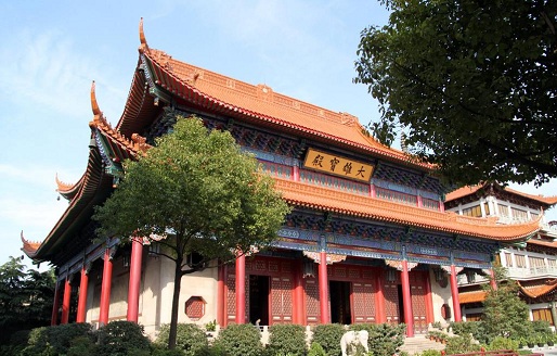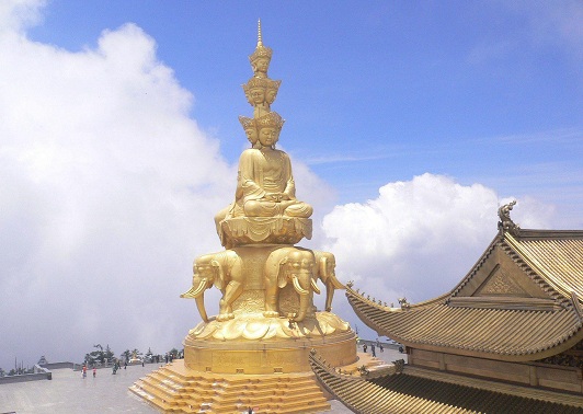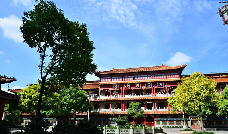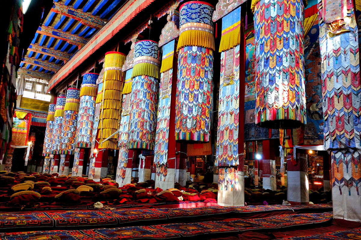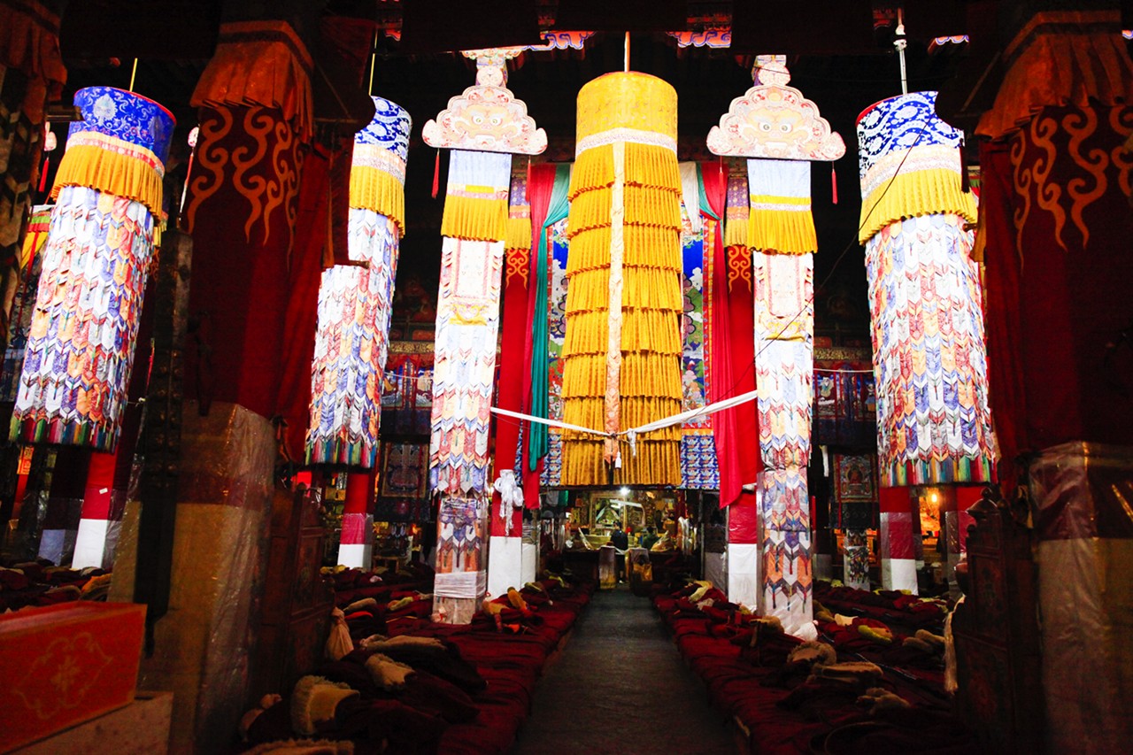 经堂雕梁画栋,依柱是悬幢,帏幔交织,五光十色,加上后面醒醒目的鎏金铜像,盏盏长明油灯,显得十分富丽堂皇。特别是大殿中间的大文殊像及白伞盖像极为精致。这里供有哲蚌寺的主要信仰物——右旋法螺。这是哲蚌寺在破土新建时,宗喀巴祖师从“廓布山法库”掘出的一只法螺,赠予弟子扎西班丹,预祝他建寺圆满成功,并以此为基地,弘扬佛法,广建寺庙。弟子扎西班丹把它尊为佛祖所赐的寺宝,珍藏在寺内。