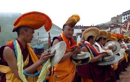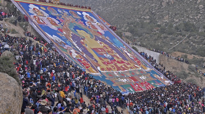 藏历六月三十日“雪顿节”当天,先是以哲蚌寺为中心,清晨展览巨幅佛像唐卡画,所以又叫展佛节,晒佛节。每年这天,哲蚌寺的僧人们要在根培乌孜山上挂出一副高三十米、宽二十米的巨幅唐卡--南无释迦牟尼佛像,供人们前往瞻仰。那一天,人们天不亮就纷纷从四面八方聚集到西藏最大的寺庙哲蚌寺所在地根培乌孜山,山下汇成人的山、人的海。朝佛者、观光客每年都达数万人,平日里寂静的山谷为之沸腾。经过不到一个时辰,大佛被重新卷起,抬回到到措钦大殿敬奉,只有待到来年此日才能再次向世人展示。接着举行藏戏会演等等,实为僧俗同乐的节日。