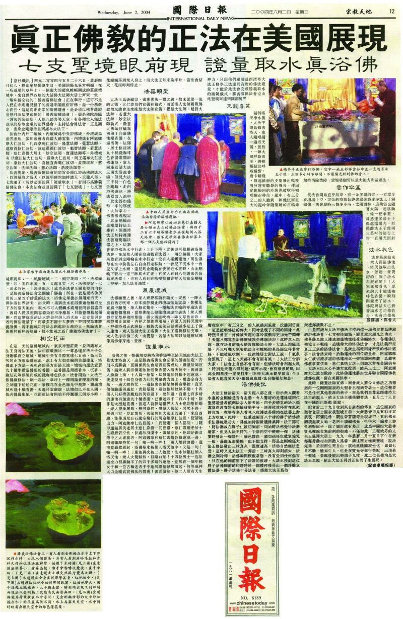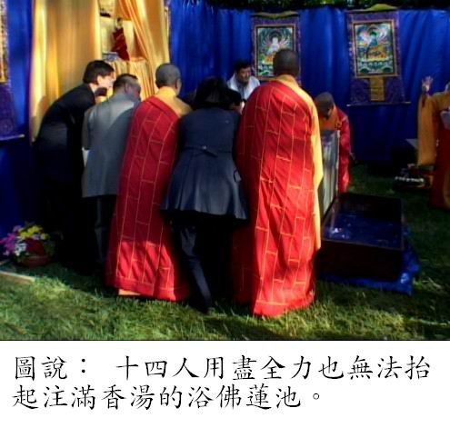 大法王师父主持修法,庄严浴佛之后,此时众人必须将浴佛莲池内的法水请出来,转到旁边的浴天池,再由大法王祈请佛陀加持沐浴水来浴诸天,这是胜义浴佛法会必须的胜义境,否则就不名为“胜义”,而且更关係到法会是否真正的成了胜义浴佛法会。按照法义规定,是不允许把这水一桶一桶从浴佛池中打起来,倒进浴天池的,而是要把浴佛池中的水抬起来,倒进浴天池中, 才属于合法取水。 这个正方形的浴佛莲池自重约七百磅,再加入九十桶浴佛香汤,已重达四千两百六十磅,当时就上了十四个大男人合力去抬,但丝毫也动不了,大家轮番上阵,纷纷用尽了吃奶之力,青筋暴跳依旧无功而返,浴佛莲池丝毫未动,无法把浴佛池中的水取到浴天池中。这时法会没有成功的象徵,这实在太糟糕,因为没有取出法水来浴诸天,而这四千多磅重的浴佛池,把大家的力气都加上去了,也无法解决。