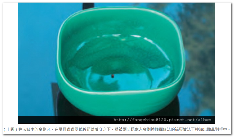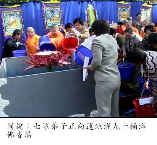 大法王师父开始加持浴佛莲池中的香汤水,大家倒入了九十桶水,每桶约重四十磅。大法王师父把白色法轮丢进了浴佛莲池中开始神变,就在此时,众人看到浴佛池中,出现了几个金刚相,彩色金盔金甲,红绿黄多色变换的绸缎服装,金刚们动作猛切,变化无穷,威猛怖畏,这一圣境现前吹破了一切黑业,众人惊歎不已,于此又是对大法王师父讚莫能穷,这个时候的大法王师父已不是我们日常生活中见到的大法王了,而是一位至高无上的天底下第一巨圣德,但大法王到底是谁转世,我们认为不是文殊菩萨,也是观世音菩萨吧!