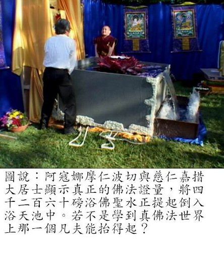 现在只有两个人上场,大家依然很紧张,究竟能不能成功抬动呢?只听到他们两人高声唸诵“嗡啊吽!”这浴佛池竟然随著咒音被撼然抬起,两个人就把浴佛池中的水“哗 !哗 !哗 !”地倒进浴天池,众人大惊骇然,激动无比,哗然吼出“哇!”“嘿 !” “我的天啊 !”“Oh !My God !”讚声骤然彼起,打破了刚才幽寂的空气,个个喜容于面!法会中完成了证量取水的关键仪式,大家惊讶讚叹,激动欢喜不已,如此超凡入圣的佛法,就在此刻展示了天下无敌的实况,众人在如来正法现前下,不得不五体投地。大家看到他们两位已经抬起来了,这时众人一哄而上,所有的人共同用力,结果照常丝毫不动,抬不起来,大家不甘心,就把浴佛池中的水打起来倒了一半,大家合力再抬,照常抬不起来。