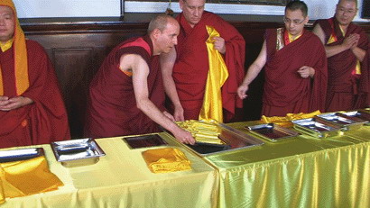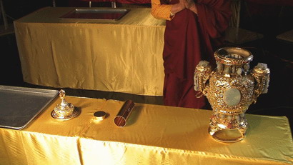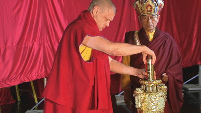…圣者们都是如语、实语,难道如语、实语的圣德还会用过奖之词吗?我们相信他们是大圣德、是对众生负责的,他们绝对不会不负责任,信口开河乱写文凭来欺骗众生的。南无羌佛说:你们说得很好,他们是大圣德,一点也没有错,我是三世多杰羌。法王们不会乱写文凭,但是我也是一个惭愧之身,我做不来金瓶掣签。在这种情况下,我们确实没有办法了,回到庙上,与仁波且们共商,大家的意见是一定得由南无羌佛掣签,如果当今最高第一大圣顶圣如来都没有掣签的道力,那么全世界就再也找不到第二圣了。因此,我们又再次拜见了南无羌佛,我们顶完礼还没有说话,南无羌佛就说:高僧大德们,你们让我安静一下好吗?无论你们怎么说,我是不会去搞金瓶掣签的,你们要我作认证,我已经说了我的看法,你们还不甘休,太过份了吧。在这彻底没有办法的情况下,会裡决定只好敦请造诣高深、曾胜义取水浴佛的第四世禄东赞尊者作金瓶掣签。