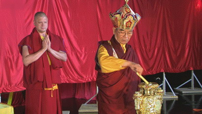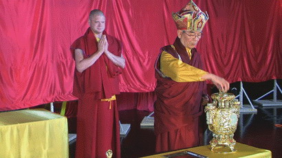 正当大家束手无策的时候,宣仪的隆慧大师也很著急,便问众人说:“你们谁能上来取水呢?”全场鸦雀无声,大家都低头不语,于是隆慧大师点名阿寇拉摩大仁波切说:“大仁波切啊!您能上来取水吗?”阿寇拉摩大仁波切请示了大法王师父,徵得大法王师父的允许后,便说:“感谢大法王师父同意我取水,但我还要选一个人协助。”于是便找了禄东赞法王。