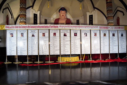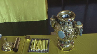 就这样,进行了一个月的法会,诵经、持咒、修仪轨,最后把所有仁波且们的认证和南无羌佛的认证排在一起,由于南无羌佛是至高顶圣如来的身份,因此在作金瓶掣签之前的三分钟,我们便把他老人家认证的名单号码划上了红圈,其他法王、仁波且们作的认证没有划圈,然后用红布盖起来。除了划圈的一人之外,没有任何人知道是第几号划了圈,包括登台掣签的禄东赞尊者也不知道哪一条、哪一号划了圈,但是公开宣佈了划上圈的是南无羌佛作的认证。而且采用三组不同的比丘尼、法师和仁波且们在公众监视下,各组做不同的封签过程,互不参与,每支签用尺度打量,公众让大家见到,其长短、大小、色泽一模一样。当签在第三道程式密封进黄绸袋中之后,这时所有的人包括密封签的人,没有一个人能知道哪一支签是多少号。这一次金瓶掣签共认证十二位大德,第一位被认证者是从 120支签中掣出一支,第二位被认证者是从119支签中掣出一支,最后一位是从109支签中掣出一支,十二支签全部掣出后,在未揭开签条的密封时,大红布板首先落幕,南无羌佛所认证的划上红圈的法王、仁波且们的转世身份和号码暴露在众人的面前。此时,开始把密封的12支签在众人面前和摄影机的全程摄影之下拆开核对,南无羌佛所认证的法王、仁波且们的真实转世身份,十二位元全部中签,准确无误,一支也没有错位!这时,再把剩下的108支签也公众打开,排起来以后从1号到120号。我们只能说,这才是真正的南无羌佛顶圣如来法界第一最高古佛给众生点上了拜见佛菩萨的指南明灯!佛陀认证了法王、仁波且们的真身转世和化身再来,成了佛教史上最殊胜的认证。( 摘自: 《多杰羌佛第三世》正法宝典 )