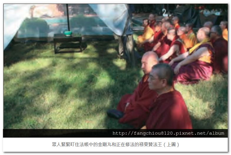 与此同时,整个天空万里晴空,豔阳高照,却有一朵祥云飘然坛城上空,云朵的阴影遮罩著悉达多法王子的铸像,像一把伞盖,从法会开始到结束,一直为释迦牟尼佛法王子像遮挡阳光。