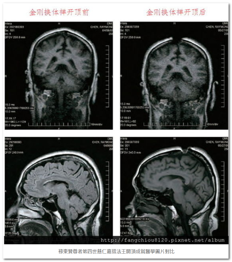 这是禄东赞法王修境行法“金刚换体禅”前后,MRI核磁共振仪脑断层扫瞄检测照片。可以清楚看见,开顶后,头顶大乐轮门处的头骨、皮层和肉、脑髓裂开约一英吋宽。