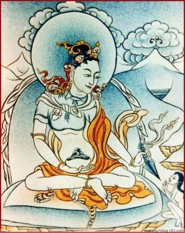 尊為莲师意中明妃。於莲师前受灌顶时,投花於事业金刚橛坛城中,从而亲睹普巴圣众,获证殊胜成就,调伏祖辈之寻香鬼。又复亲睹无量寿佛胜尊坛城,获证长寿悉地。因获得杀度复活之成就故,於尼泊尔国将被武器杀死之人身复活。